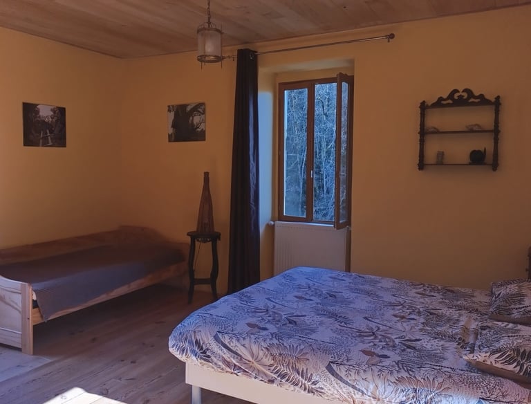 Chambre 3 personnes avec lit double et lit simple, salle de bain et WC privatives, 80 € la nuitée, petit déjeuner compris.